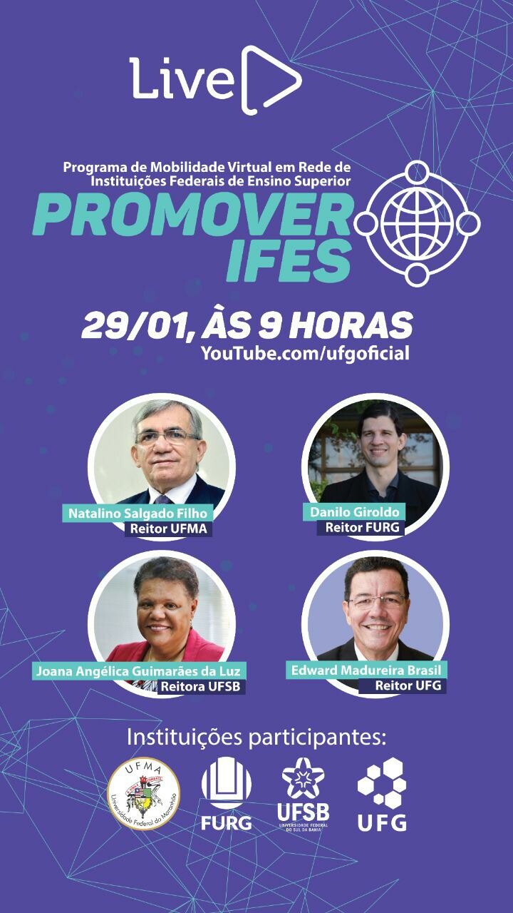 Os reitores das Instituições Federais de Ensino Superior (IFES), Universidade Federal de Goiás (UFG), Universidade Federal do Maranhão (UFMA), Universidade Federal do Rio Grande (FURG) e a Universidade Federal do Sul da Bahia (UFSB), por meio do Programa de mobilidade virtual em rede IFES (Promover IFES), tornam público este edital de processo seletivo para cursar disciplinas/componentes nos cursos de graduação para estudantes regulares das IES participantes.