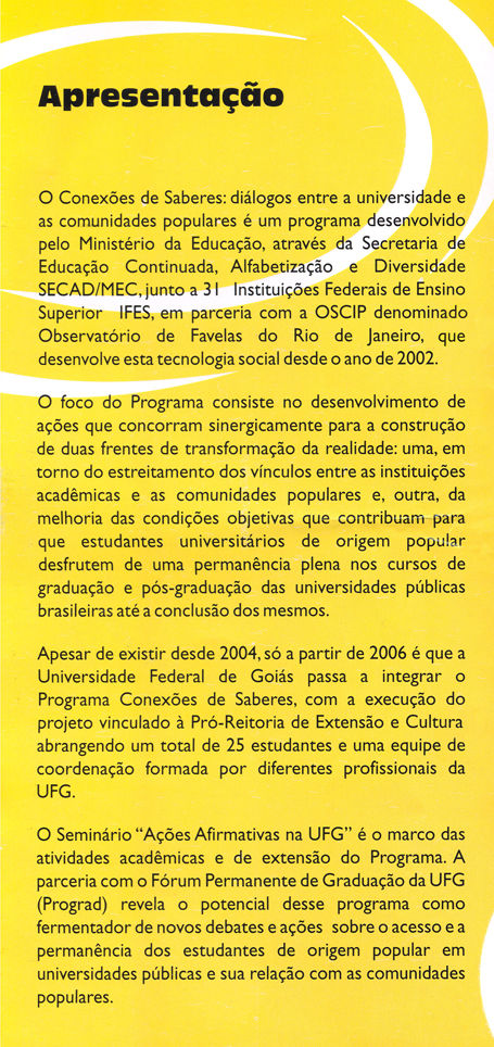 AÇÕES AFIRMATIVAS NA UFG Lançamento do programa Conexões do saberes 2006