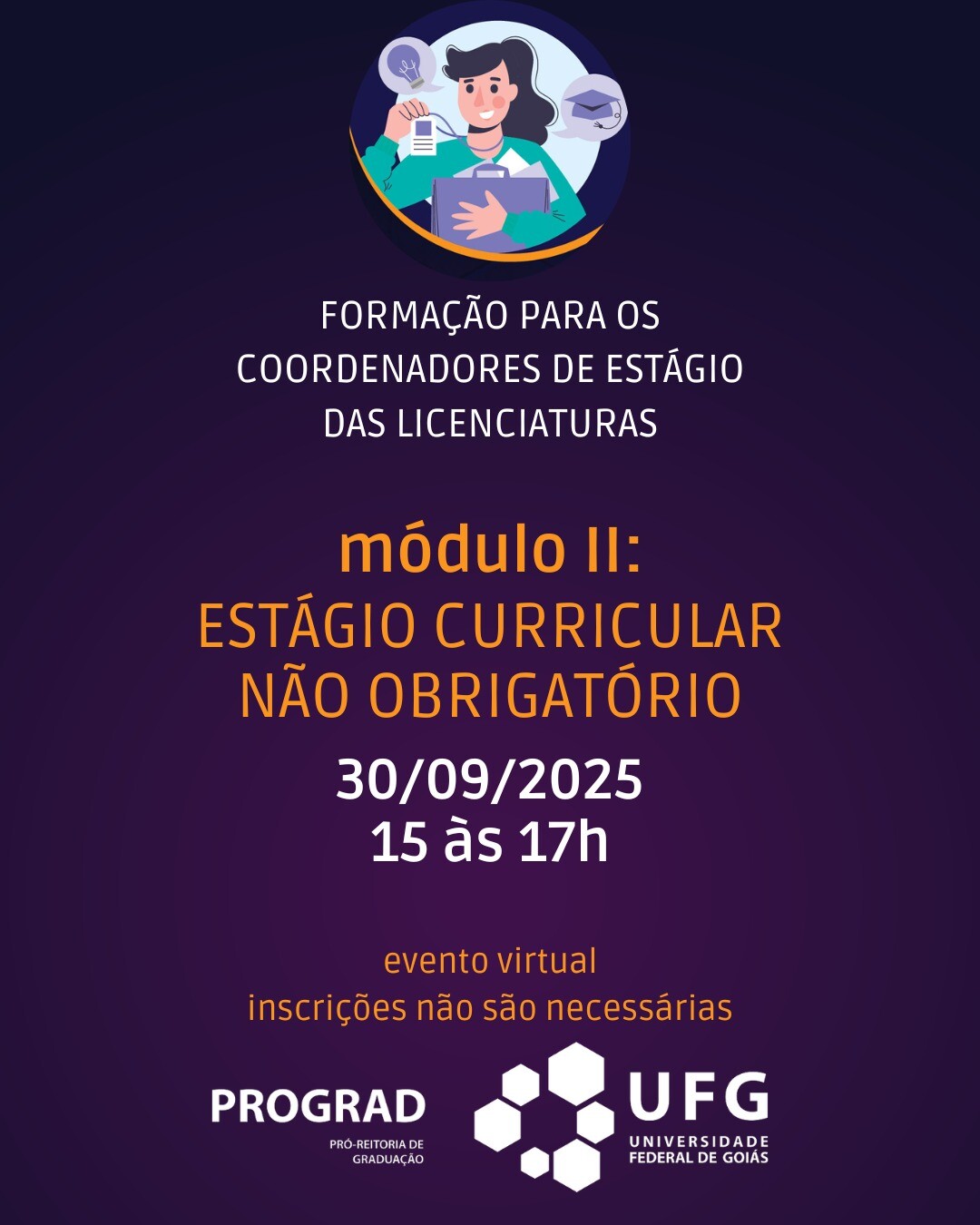 A Coordenação Geral de Estágios, por meio da Diretoria de Acompanhamento e Promoção Estudantil (DAPE/PROGRAD/UFG), convoca os(as) Coordenadores(as) de Estágio dos Cursos de Licenciatura para a Reunião de Formação – Módulo II: Estágio Curricular Não Obrigatório.