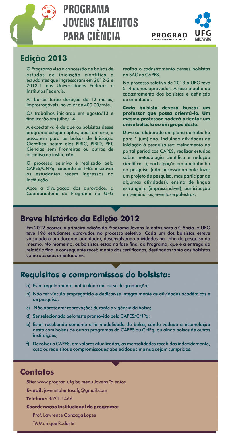 a)    Ser selecionado pelo processo seletivo do Programa Jovens Talentos para a Ciência promovido pela CAPES/CNPq;